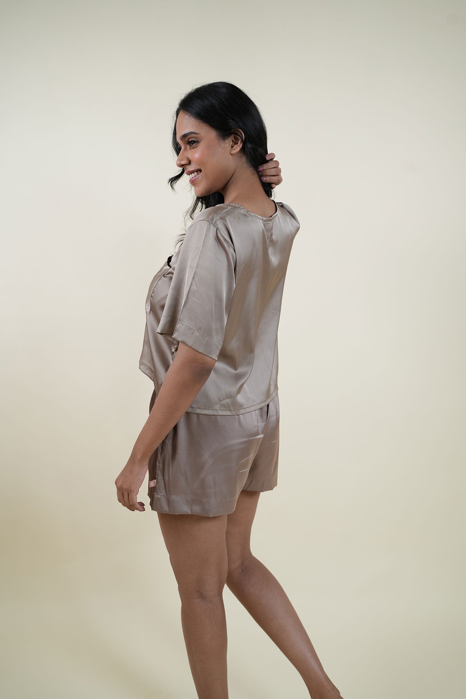 A statement gold cropped button-down shirt crafted from lustrous satin, featuring a loose fit and elegant contrast buttons for a polished finish. it brings a bold yet refined touch to day-to-night styling.