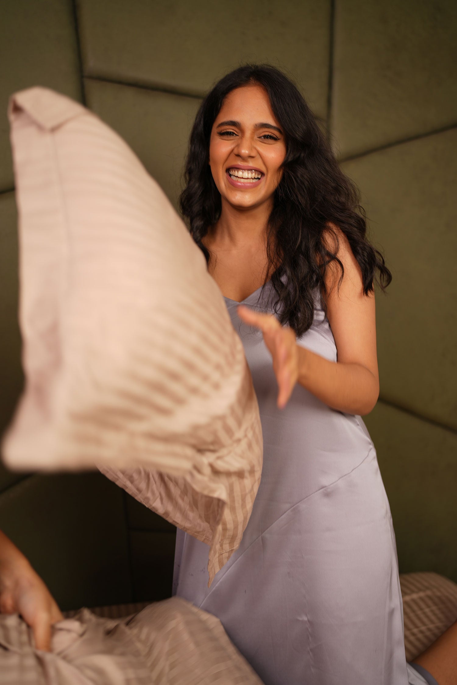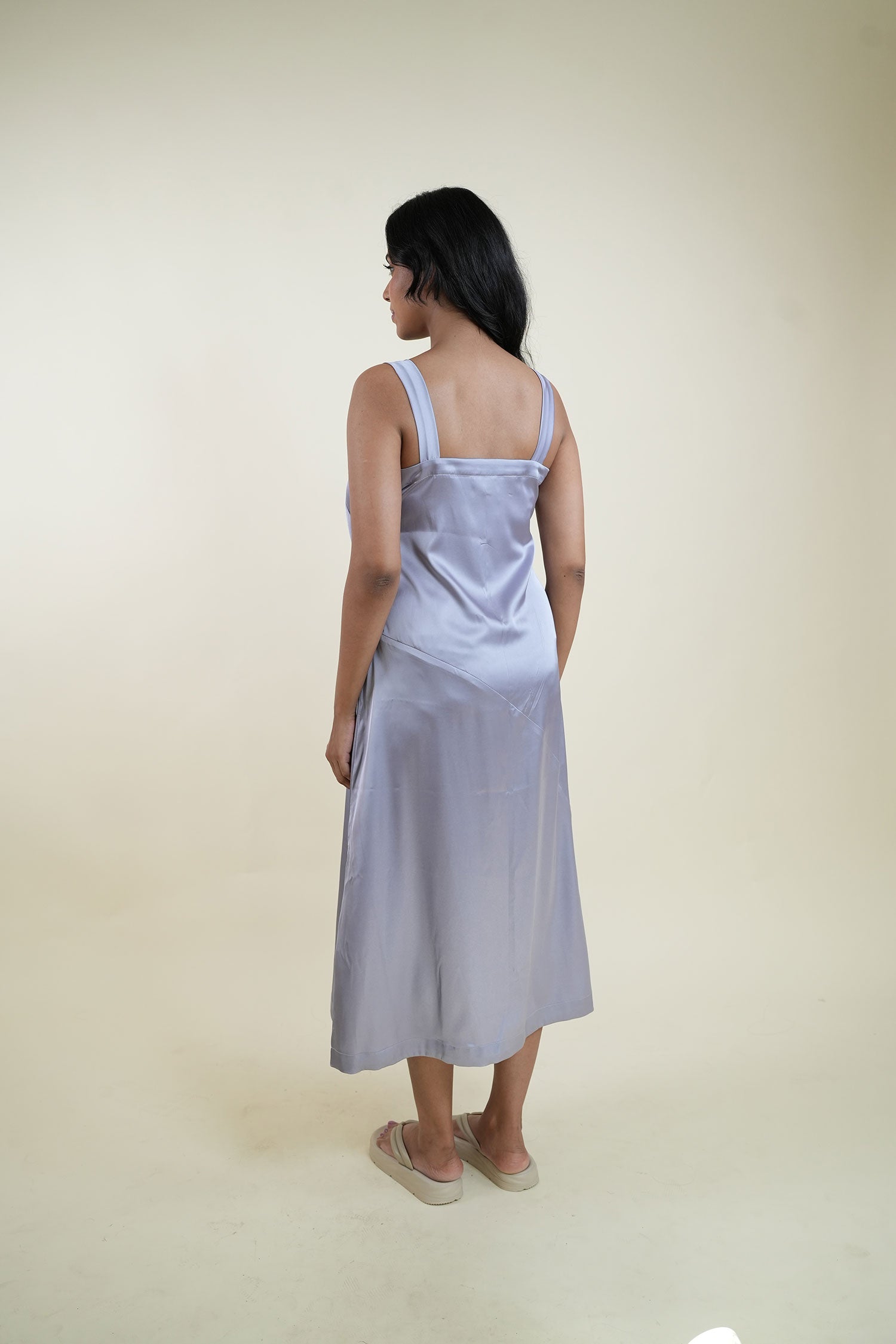 A graceful silver-grey midi dress crafted from fluid satin, designed with thick straps for a structured yet comfortable fit. Its gentle flow and lustrous finish create an effortlessly elegant look, perfect for both relaxed days and refined evenings.