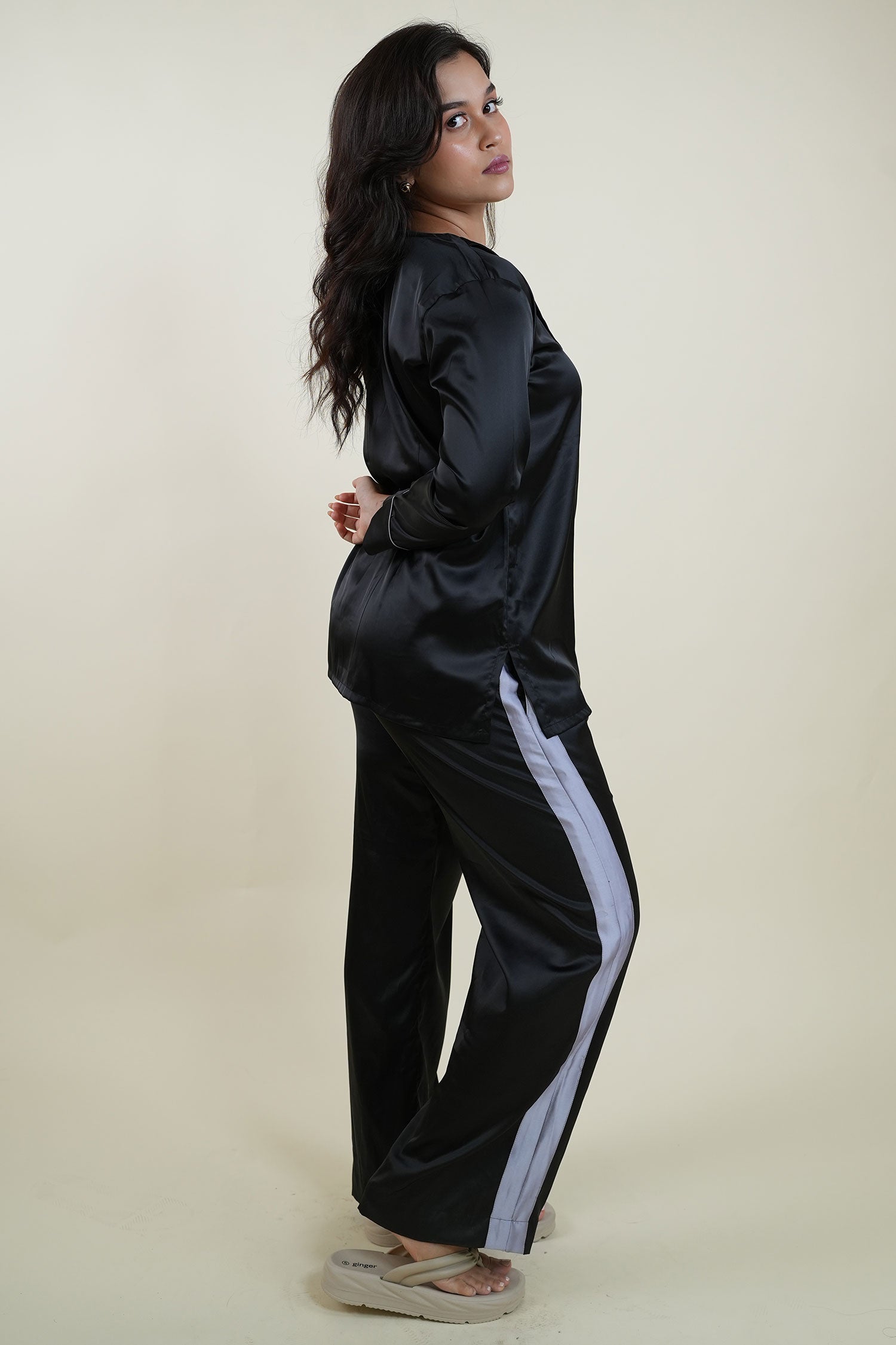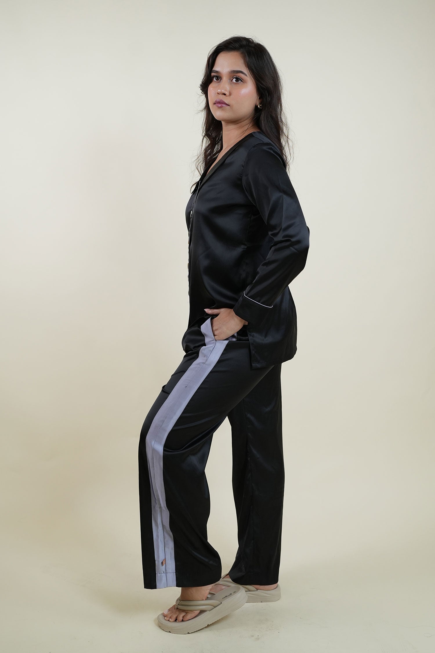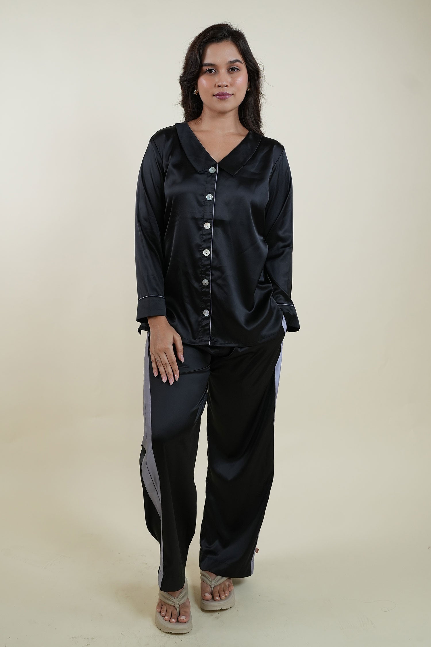 Elegant charcoal and ash lounging bottoms in smooth satin, designed with a relaxed fit and an elasticated waistband with side pockets for all-day comfort. The subtle sheen and refined color pairing bring a touch of sophistication to your loungewear collection.