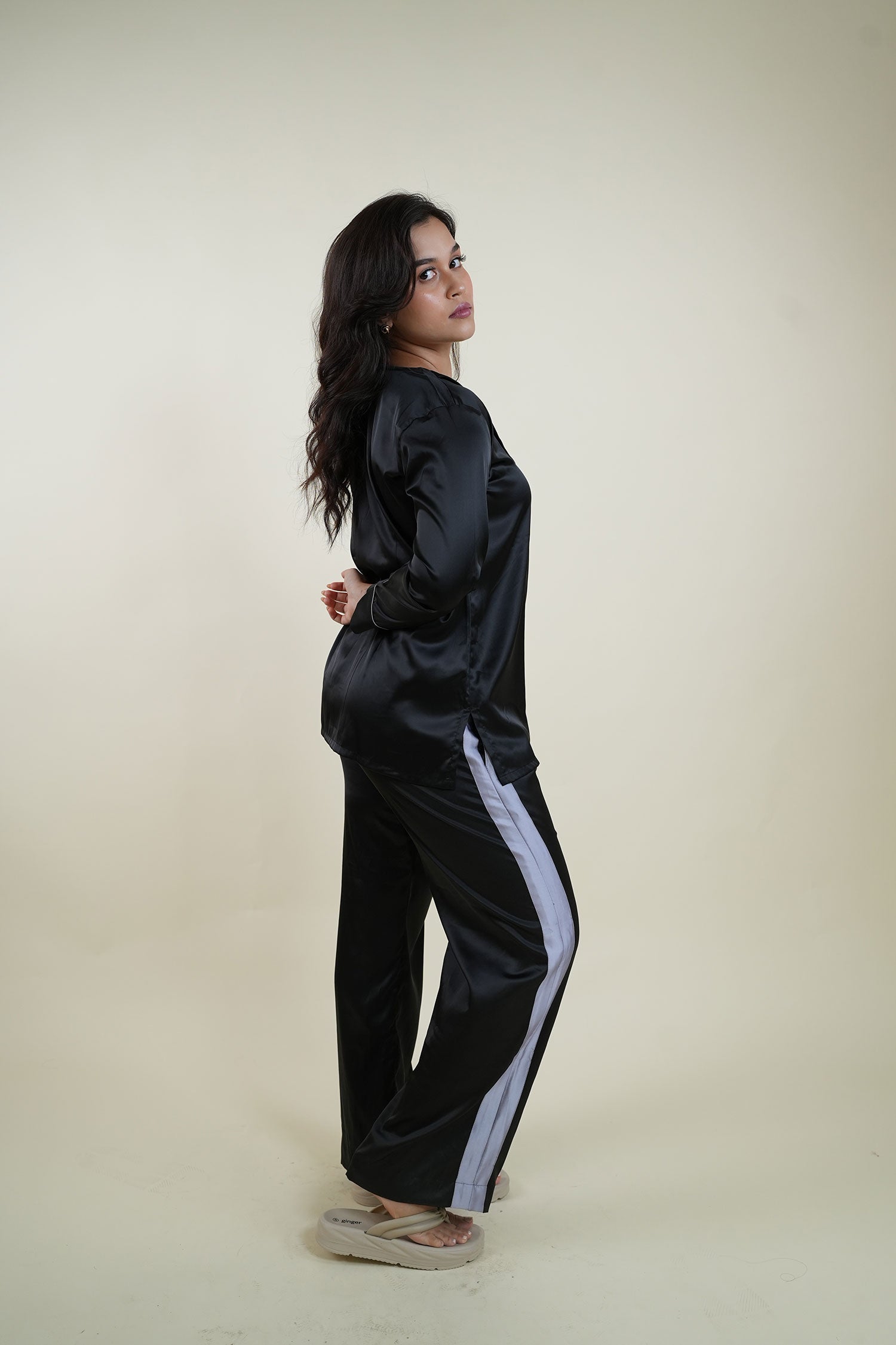A sophisticated charcoal and ash button-down crafted from silky satin, adorned with elegant buttons for a refined touch. Its relaxed fit and smooth drape make it perfect for both lounging in luxury and effortless daytime styling.